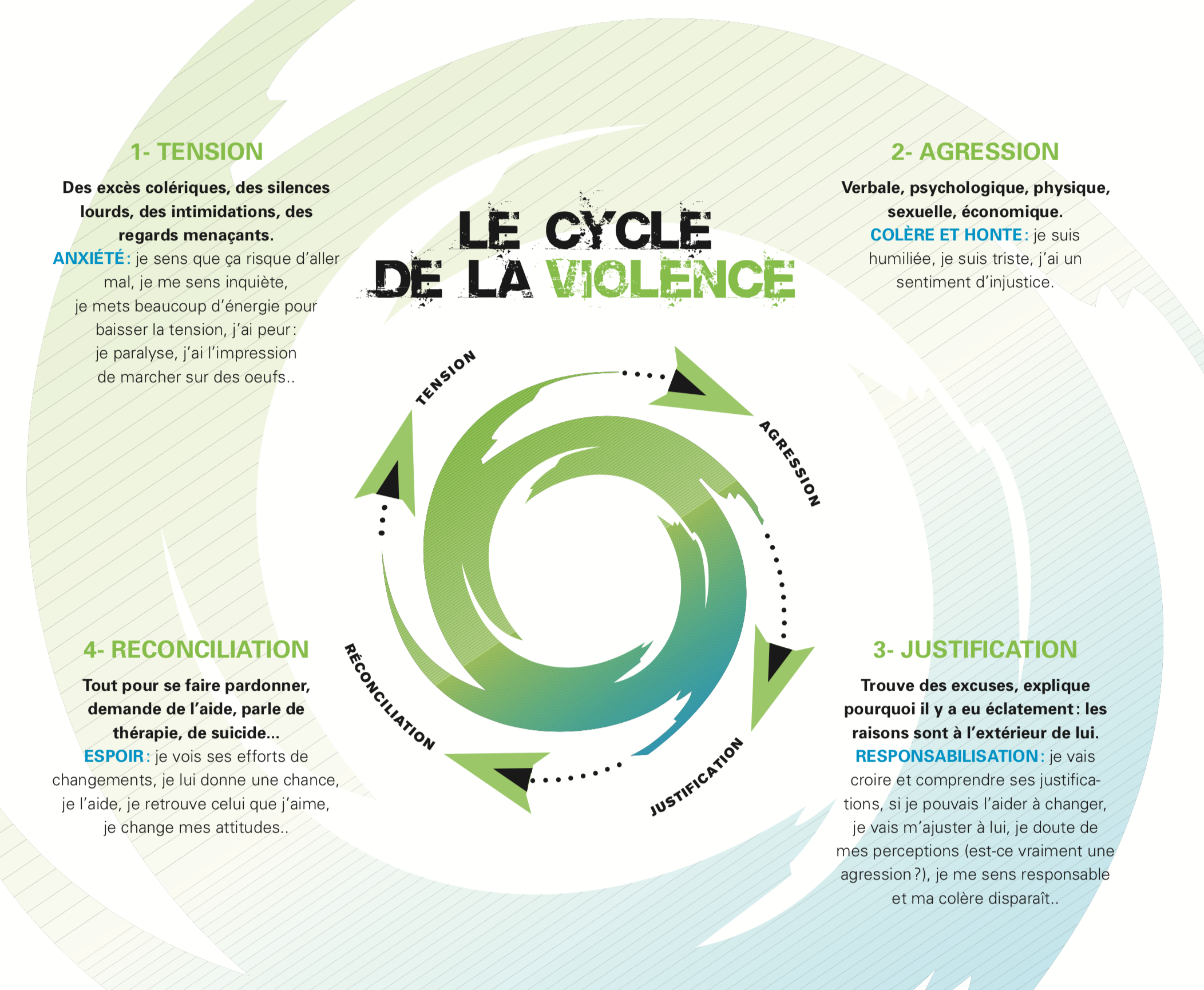 Les deux autres visent à s’assurer que sa partenaire ne le quitte pas : il s’agit de la justification et de la réconciliation. Avec le temps, ce cycle se répète et s’accélère. Quand l’emprise est bien installée, il arrive que les deux dernières phases disparaissent pour ne laisser place qu’aux phases de tension et d’agression.